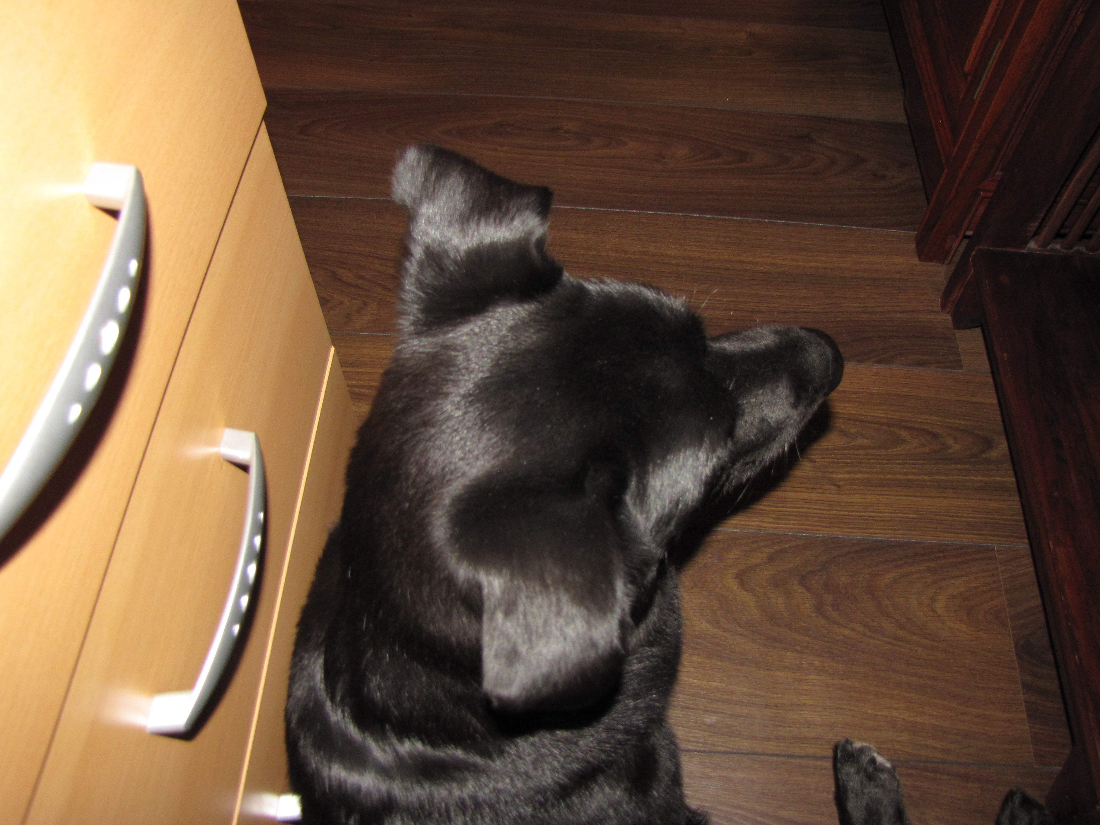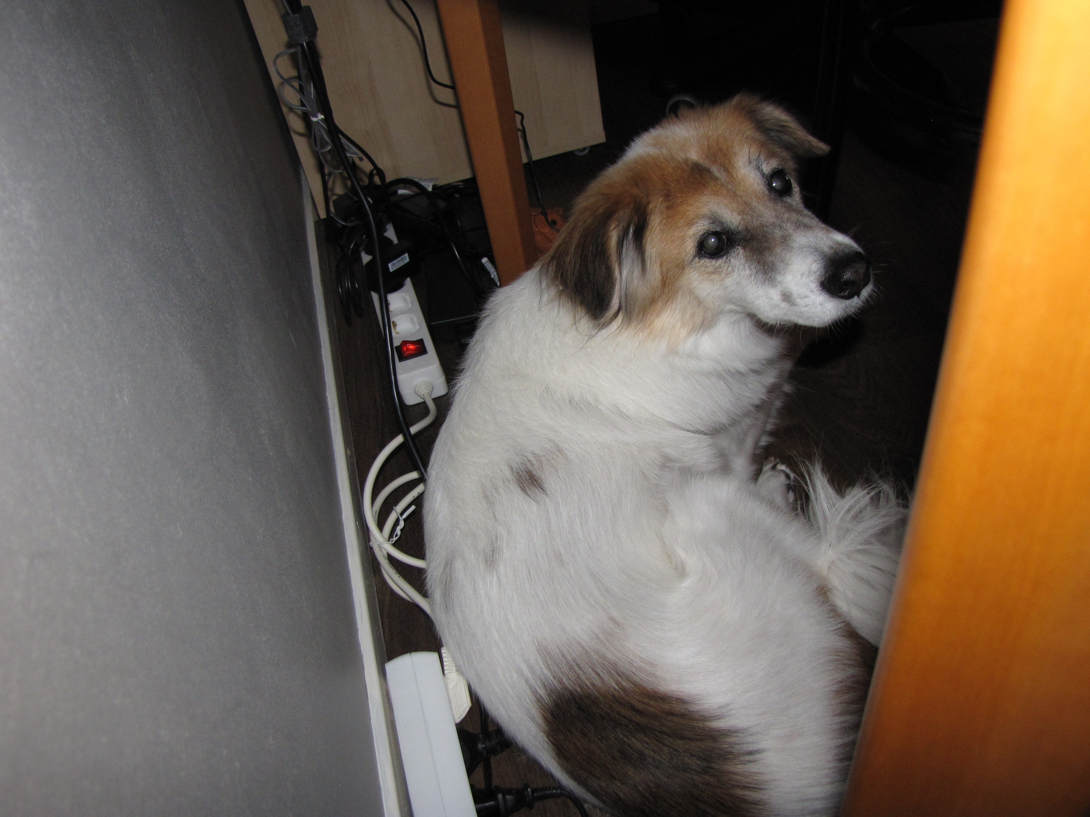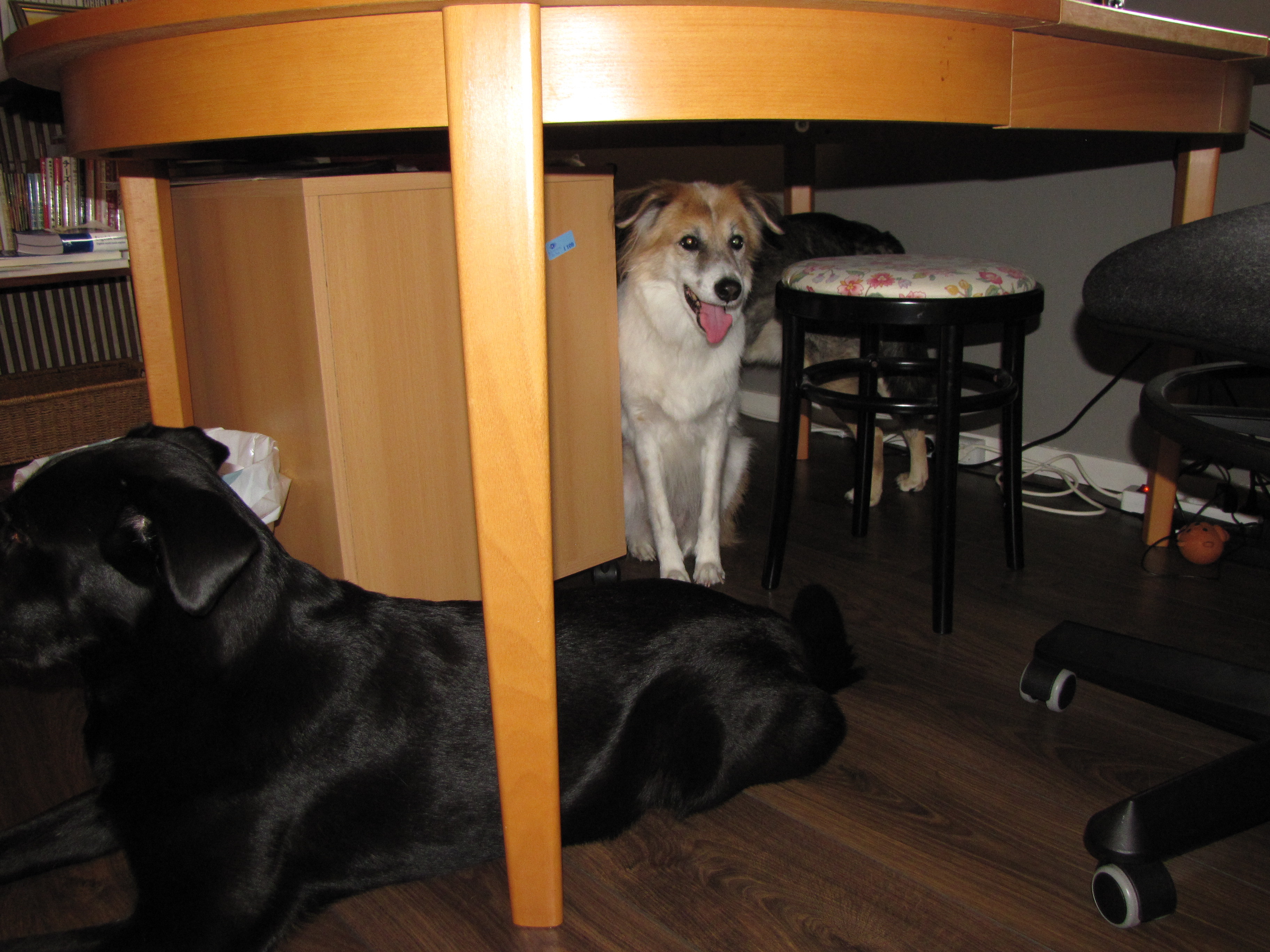 マリアさん、この家に来てから初めてコンピューターテーブルの下に入りました。