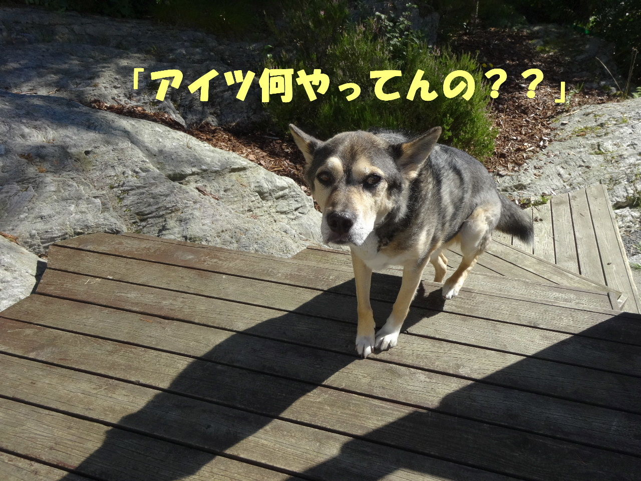 雨宿りする私たちの前を笑顔で歩き過ぎて行ったオジサマと二頭。